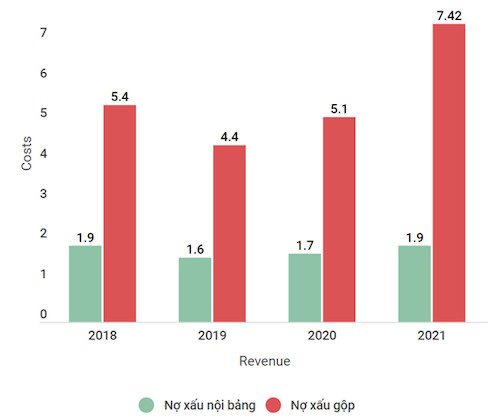 Đánh giá một cách thận trọng, tỉ lệ nợ xấu nội bảng, nợ bán cho Công ty quản lý nợ và tài sản của các tổ chức tín dụng và các khoản nợ tiềm ẩn thành nợ xấu ở mức cao là 7,42%.